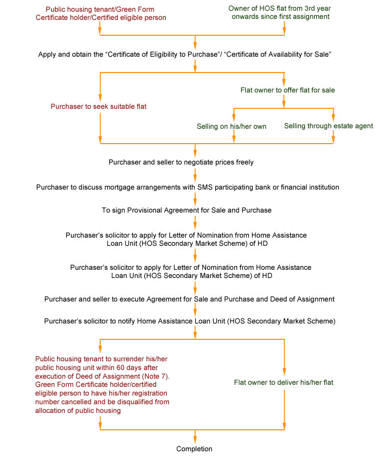 The Housing Authority (HA) formally established the HOS Secondary Market Scheme (HOSSMS) in June 1997. It enables public housing tenants and Green Form Certificate holders to purchase flats sold under Home Ownership Scheme (HOS) / Private Sector Participation Scheme (PSPS) / Tenants Purchase Scheme (TPS) (hereinafter collectively referred to as HOS flats) with the date of first assignment from the third years onwards. The launch of the HOSSMS increases the turnover of HOS flats so as to satisfy the society's need of subsidized home ownership. Apart from providing more choices for public rental housing tenants and Green Form Certificate holders to own a home, more public rental housing can be recovered for allocation to families in need. Transactions in the HOS Secondary Market are similar to that in the open market. The purchaser and the seller may negotiate the price freely and conclude the deal either directly or through an estate agent. Purchasers of flats in the HOS Secondary Market will assume the liability to pay the premium if they sell their flats at the open market in the future. Please click the following links for more information on sales of flats at the HOS Secondary Market: Sell in the Secondary Market:HOS flat owners, from the third year onwards from the date of first assignment, may sell their flat in the HOS Secondary Market to tenants of rental housing estates managed by the HA or the Housing Society (HS), authorized residents of Interim Housing managed by HA, or holders of Green Form Certificate issued by the HD without payment of a premium to the HA. Flat owners may obtain application form of Certificate of Availability for Sale from District Tenancy Management Offices, and the Home Assistance Loan Unit. The completed application form should be submitted to the District Tenancy Management Offices concerned together with application fee and a copy of the Deed of Assignment. The application fee shall be paid in the form of a crossed cheque / cashier order payable to the "Hong Kong Housing Authority" (existing charge is $930). A Certificate of Availability for Sale will be issued to the HOS flat owner after the HD has verified the application. Sell in the Secondary Market: TPS flat owners, from the third year onwards from the date of first assignment, may sell their flats in the HOS Secondary Market to tenants of rental housing estates managed by the HA or the Housing Society (HS), authorized residents of Interim Housing managed by HA, or holders of Green Form Certificate issued by the HD without payment of a premium to the HA. Flat owners may obtain application form of Certificate of Availability for Sale from District Tenancy Management Office and the Home Assistance Loan Unit or click the following link to download the form: The completed application form should be submitted to the District Tenancy Management Office concerned together with an application fee and a copy of the Deed of Assignment. The application fee shall be paid in the form of a crossed cheque / cashier order payable to the "Hong Kong Housing Authority" (existing charge is $930). A Certificate of Availability for Sale will be issued to the TPS flat owner after the HD has verified the application. Owners who have sold their flats, and their spouses are not eligible to join any of the subsidized housing scheme administered by the HA (including public rental housing, Home Ownership Scheme (HOS), Private Sector Participation Scheme (PSPS), Home Assistance Loan Scheme (HALS), HOS Secondary Market Scheme, TPS) and any subsidized scheme administered by the HS. |